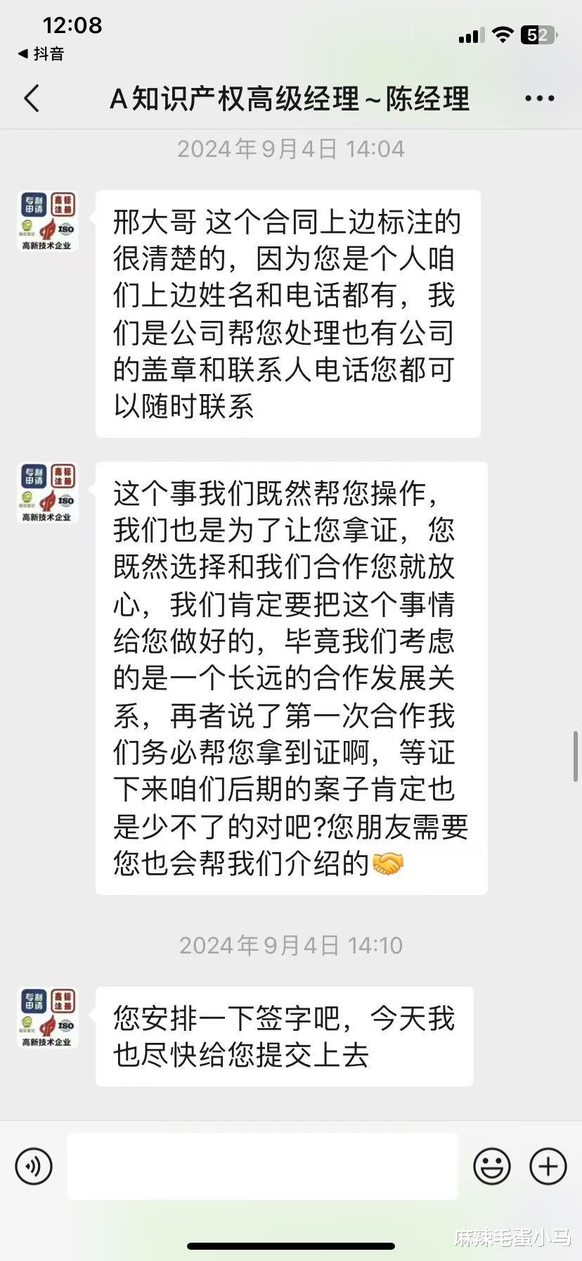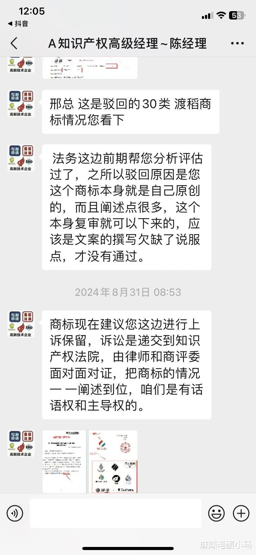 2024年8月至9月,商标申请人邢先生因其名下“渡稻”商标被驳回,通过微信联系到自称“北京安权天下知识产权高级经理”的陈希。在沟通中,对方多次强调“成功率在95%以上”“保证拿证”“律师出庭”等承诺,邢先生遂先后签订两份代理协议: