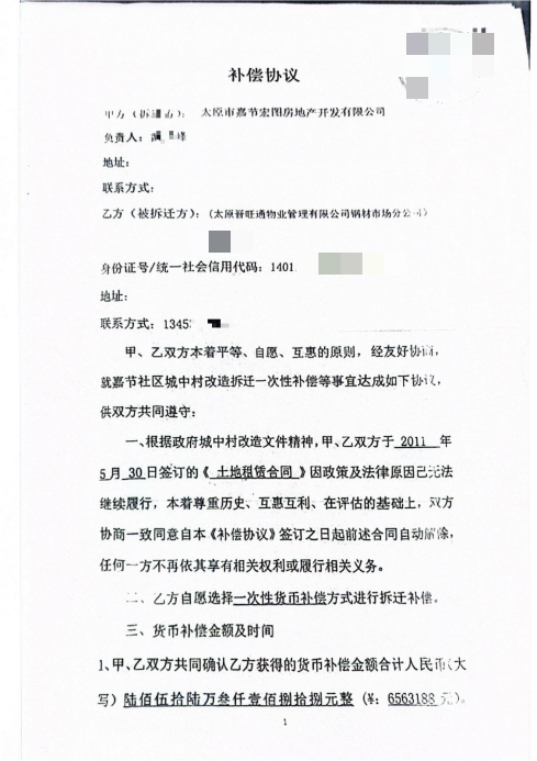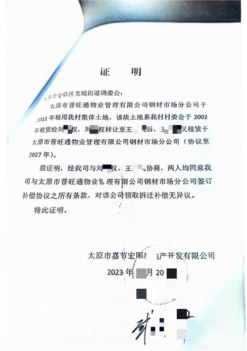 伪造文件清单中,最核心的是一份标注日期为2011年5月30日的《土地租赁合同》,文件显示签约方为宏图公司与王某艳担任负责人的太原市晋旺通物业管理有限公司钢材市场分公司。但工商信息明确显示,宏图公司2016年12月才成立,2011年根本不具备签约主体资格。此外,双方还伪造了三份关键材料:一是2023年12月的宏图公司《证明》,谎称已与土地原流转方刘某权、王二狗协商一致,同意将补偿款支付给王某艳;二是2011年3月15日的《转让协议》,篡改原始协议内容,抹除另外四位举报人的签名,将土地经营权受让主体伪造成王二狗个人;三是2023年12月7日的《补偿协议》,虚构宏图公司与王某艳的租赁事实,直接锁定6563188元补偿款的归属。