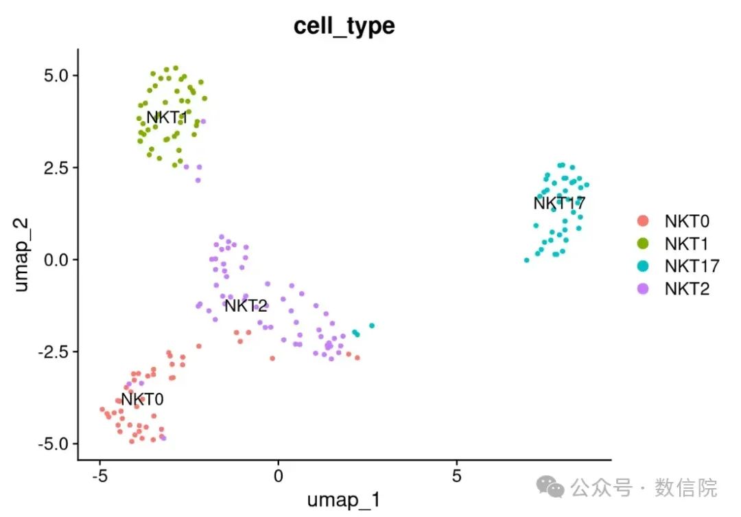 library(Seurat)library(tidyverse)dynrds <- readRDS(file ="data/NKT-differentiation_engel.rds")counts <- t(dynrds[["counts"]])cell_info <- str_remove(dynrds[["cell_info"]]$milestone_id,"vα14 inkt thymocyte subset: ")names(cell_info) <- dynrds[["cell_info"]]$cell_idNTK_seob <- CreateSeuratObject(counts = counts,min.cells = 3,min.features = 200)NTK_seob$cell_type= cell_info[colnames(counts)]NTK_seob <- SCTransform(NTK_seob) %>%RunPCA(npcs = 10) %>%RunUMAP(dims = 1:10)DimPlot(NTK_seob,reduction ="umap",group.by ="cell_type",label = T)