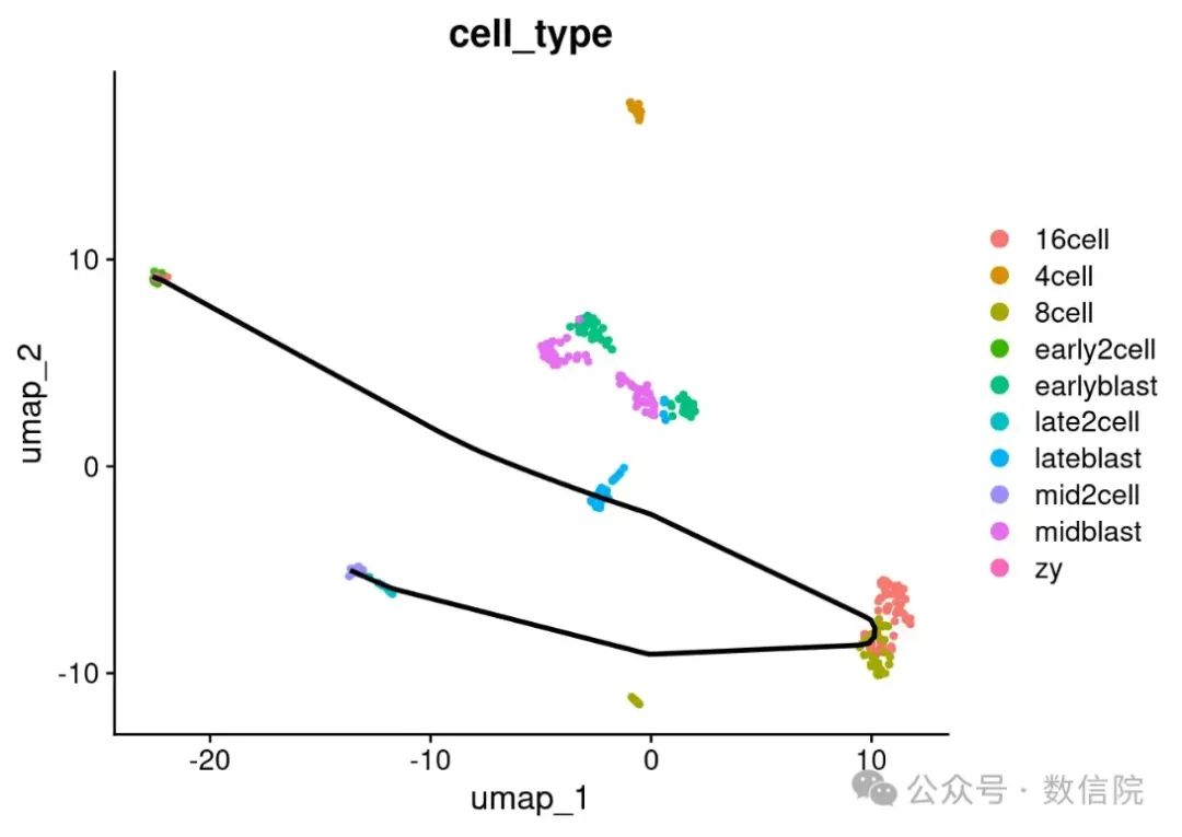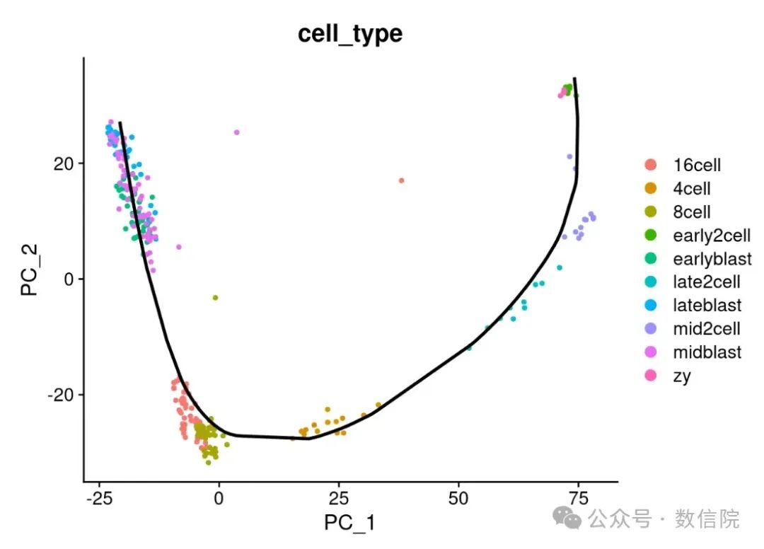 library(Seurat)library(tidyverse)load(file ="data/GSE45719/mm_seob.rdata")mm_seob <- UpdateSeuratObject(mm_seob)mm_seob <- SCTransform(mm_seob) %>%RunPCA(npcs = 10) %>%RunUMAP(dims = 1:10)# 转换为SingleCellExperimentsce <- as.SingleCellExperiment(mm_seob)library(slingshot)# 运行 Slingshot 进行轨迹推断sce <- slingshot(sce, clusterLabels ='cell_type',reducedDim ='PCA',#可替换为UMAPstart.clus = c("zy"), end.clus ="lateblast")# 分析结果可以用 as.SlingshotDataSet 提取sds <- SlingshotDataSet(sce)# 提取轨迹信息curves_df <- sds@curves[["Lineage1"]][["s"]][,c(1,2)]colnames(curves_df) <- c("Dim1","Dim2")# 可视化DimPlot(mm_seob,reduction ="pca",group.by ="cell_type") +geom_path(data = curves_df, aes(x = Dim1, y = Dim2), group = 1, color ="black", linewidth = 1)