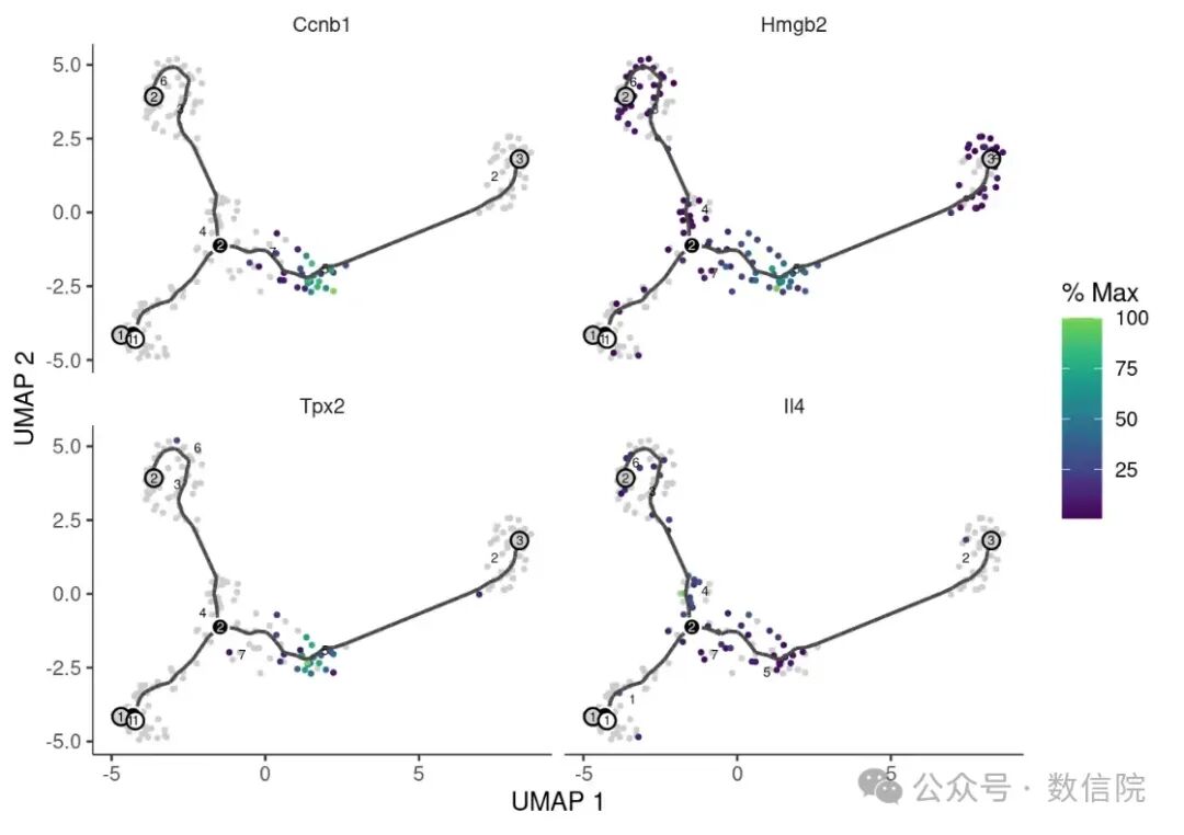 key_genes <- c("Ccnb1","Hmgb2","Tpx2","Il4")plot_cells(cds,genes = key_genes,cell_size = 0.8)