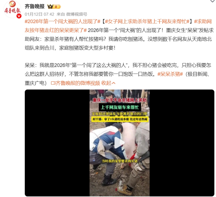 重庆合川庆福村,一位网名“呆呆”的姑娘发了条求助视频:“心疼年迈父亲无力按猪,求网友帮忙。”这句简单呼唤竟引来了超过三千名网友的奔赴,当天直播实时在线观众突破十万人。这些素不相识的人们只有一个共同目的:帮忙按年猪,吃一碗热气腾腾的刨猪汤。