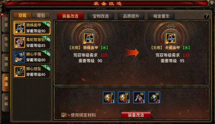 改进质量能让装备的标识变换,增强至极好至顶级。暗金重生能够调整装备的附加效果,比如冰属性能转为水属性或别的,不过这个过程带有不确定性,要是游戏者不希望更换,就别去选用暗金重生了。