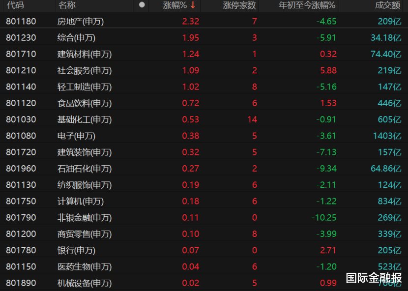 近日横盘震荡行情下,板块呈现轮动特点。今日,房地产板块领涨,建筑材料、社会服务、轻工制造板块涨幅均超过1%。汽车、有色金属、通信微跌。