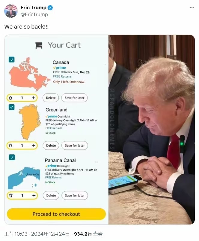 2024年12月24日,特朗普次子埃里克·特朗普,在社交媒体上发了一张帖子。该帖子的样式,模拟起了亚马逊购物车的清单。