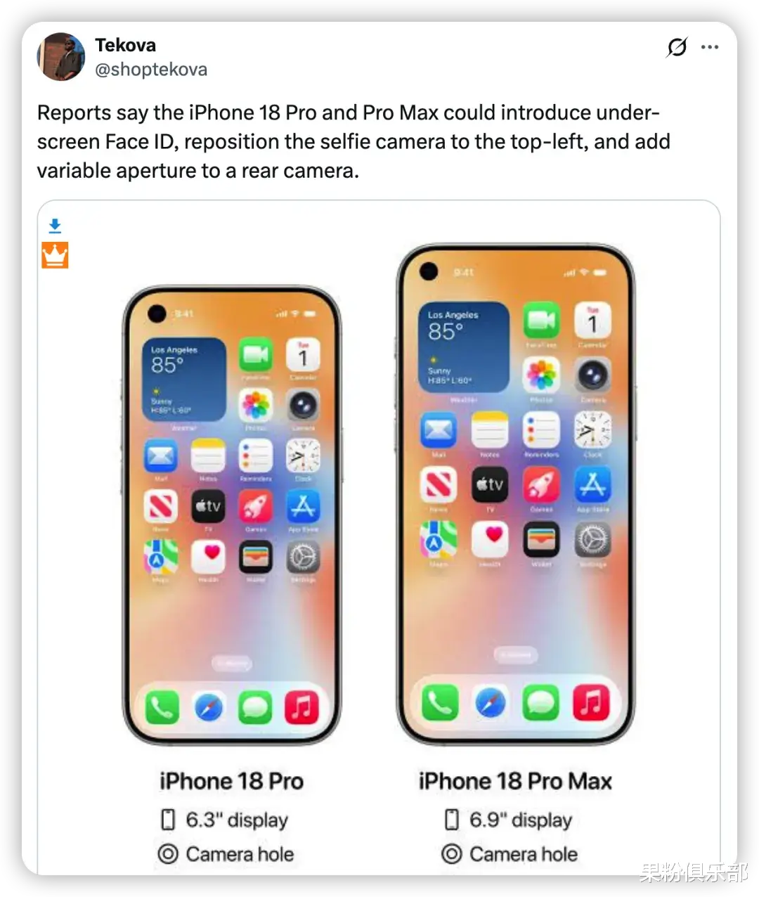 同时,开孔也将被移至屏幕左上角,并引入屏下 Face ID 技术。