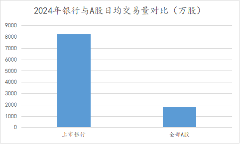 兼具避险与高收益的属性使银行成为资金主要聚集地,其交易量大幅领先A股大盘。2024年上市银行平均日交易量为8223万股,比A股平均水平高出不少(1823万股)。