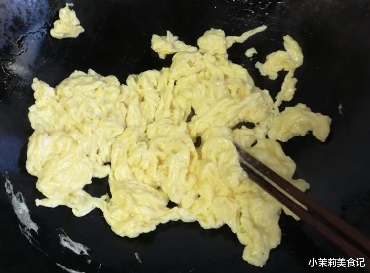 3、再来准备鸡蛋,首先要将蛋黄和蛋清充分搅拌到一起,接着把锅里的油热透,将其倒在里边去炒,凝固之后,进一步剪一剪,将其剪碎一些。