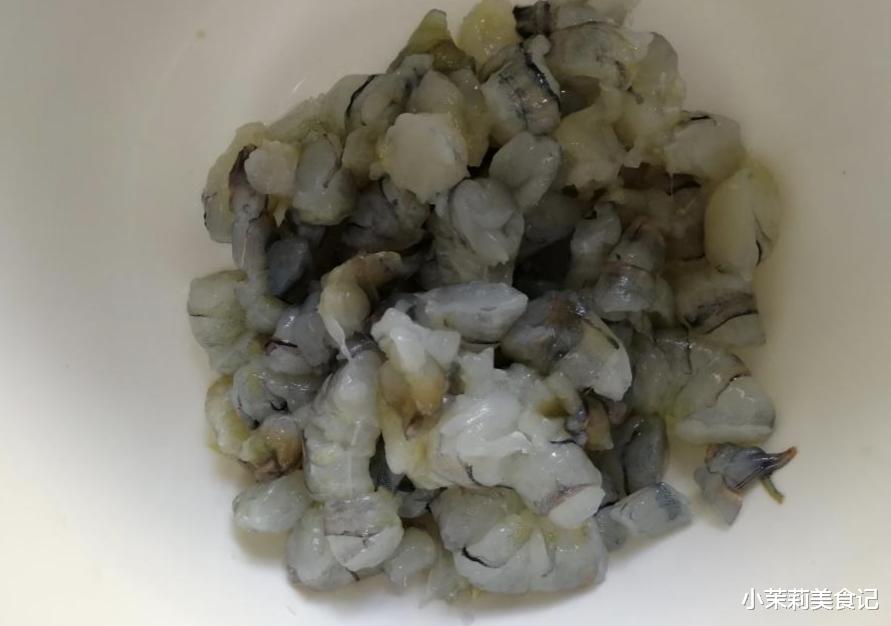2、准备出一些鲜虾,逐一把虾仁剥出来,清掉杂质后,冲一冲,待干净以后,剪成小段,并加生姜腌一会儿。
