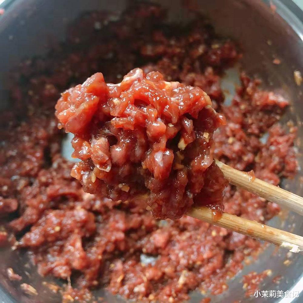 4、准备一些牛里脊,搅碎之后先在盆中调味,先加入蛋清一个,姜蓉适量,生抽,盐也放进去,充分地搅拌,令肉馅将所有的料都吸收。