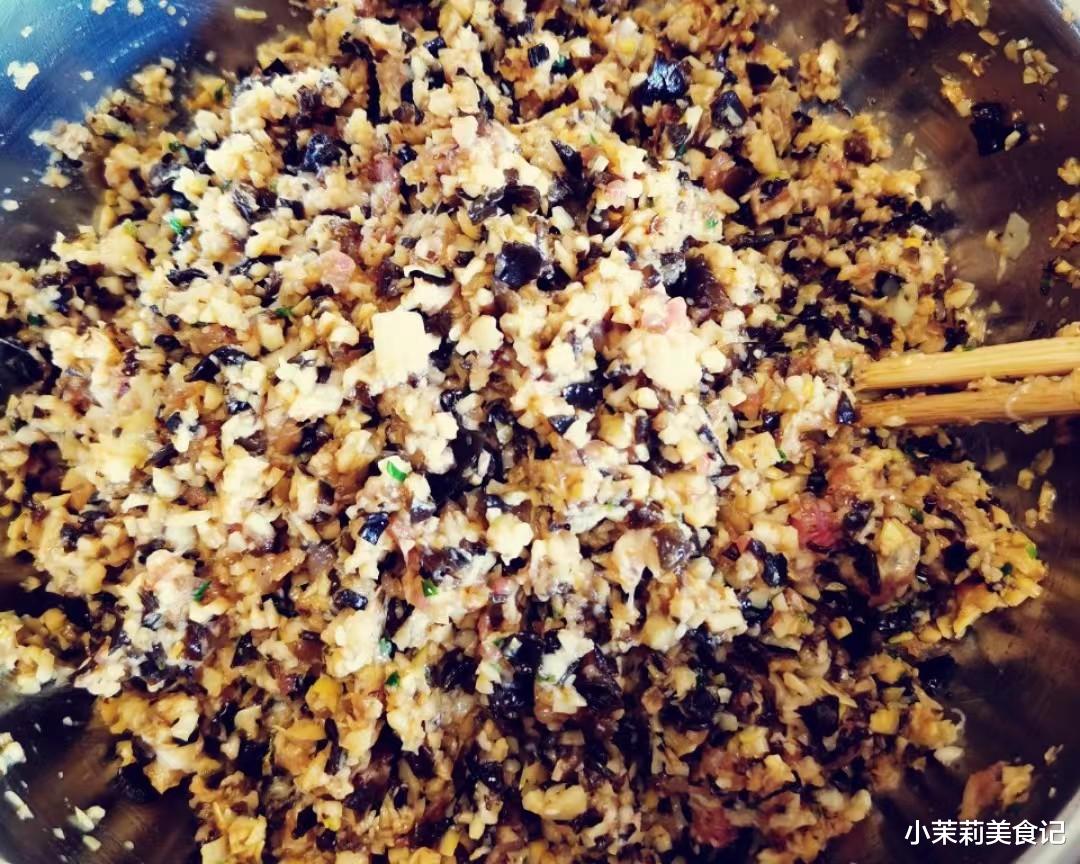 4、接着通过筷子去搅拌,令所有的菜和肉都混合匀了,届时酌情补充些盐,把咸度调整到适宜的程度,便可以开始包了。