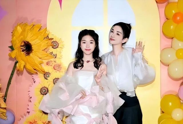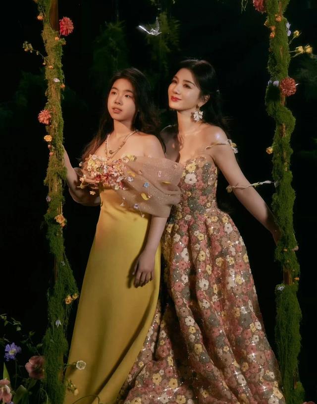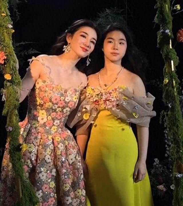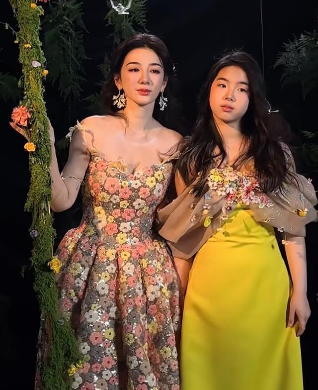 在黄奕身边站着的是她的女儿,黄芊玲完全看不出只有12岁,她设计了一个偏分造型,一头长发散在肩后,虽然没有黄奕那么好看,但黄芊玲的妆容也很精致。