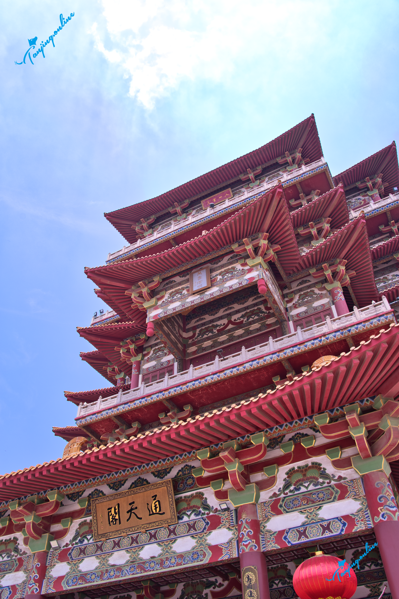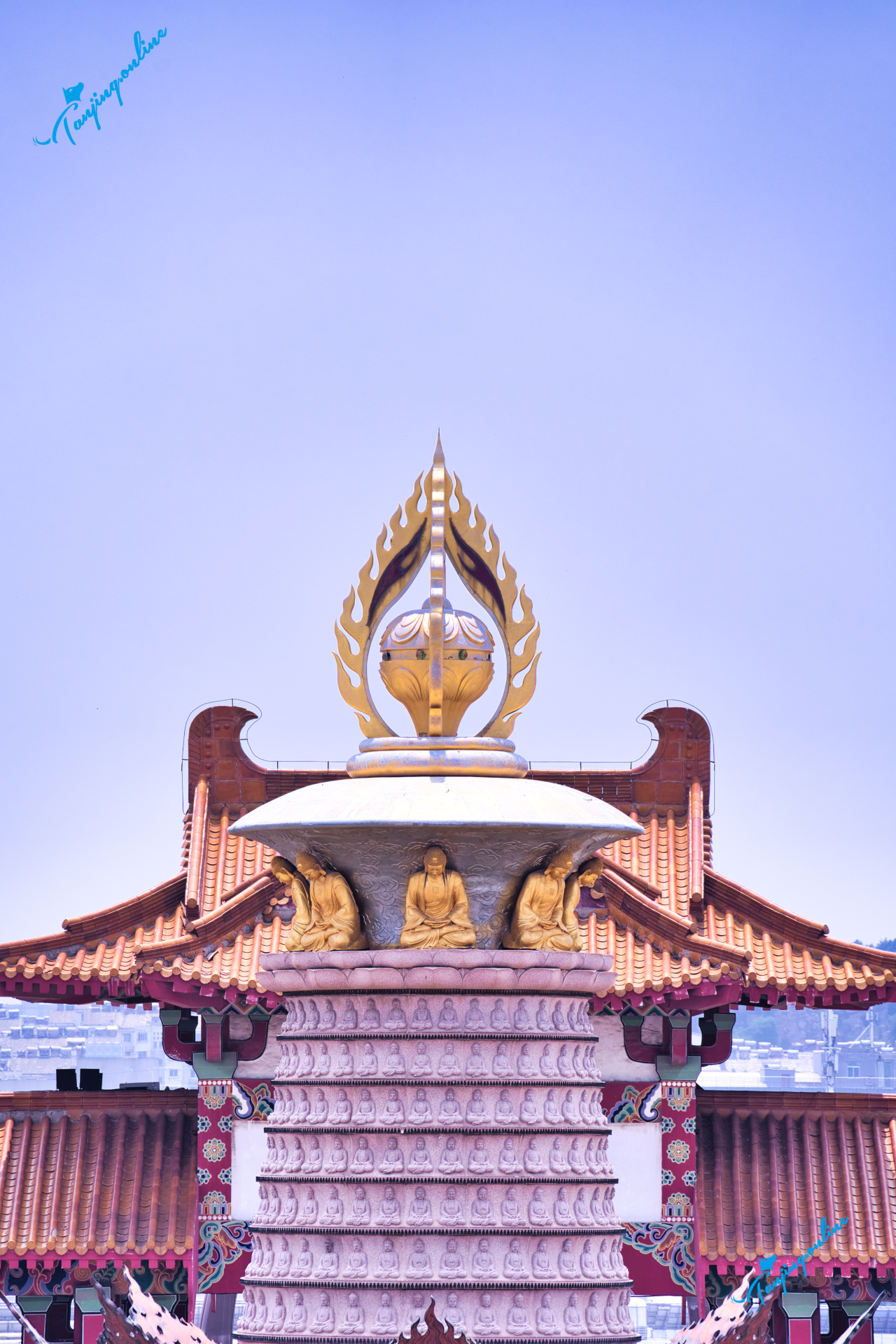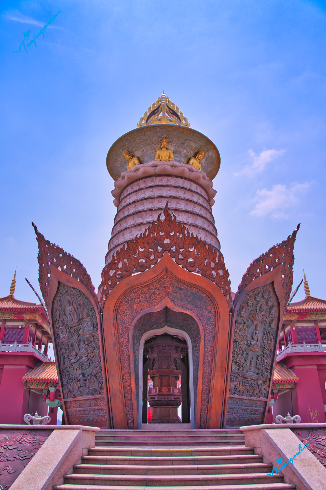 59.88米通天阁:全国最高佛阁,内供39.88米天冠弥勒锻铜像(国内最大室内铜佛),金箔覆身,晴日如佛光倾泻。