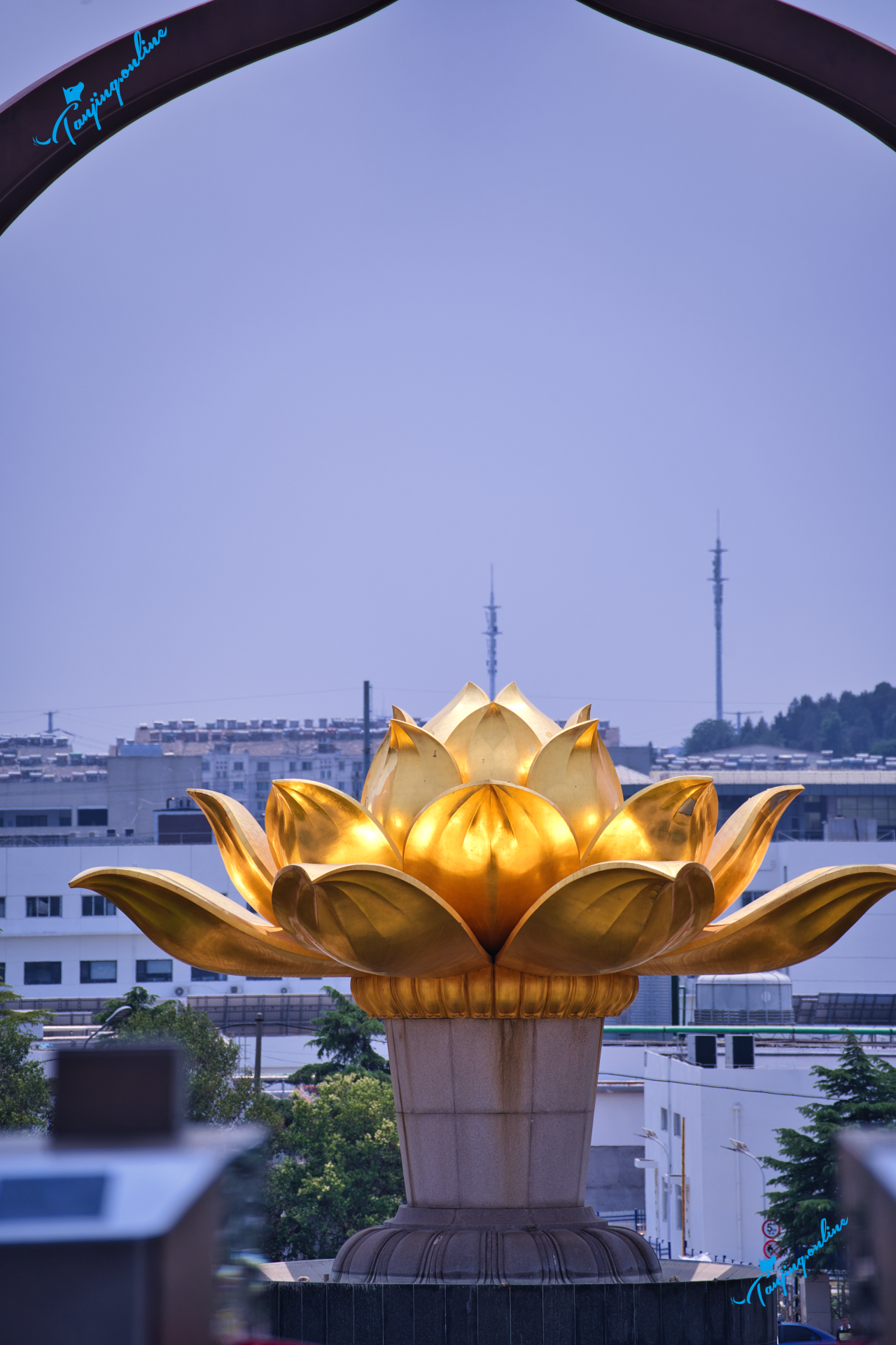 菩提圣莲广场:巨型金莲水池倒映佛阁,雨天云雾缭绕如入幻境。