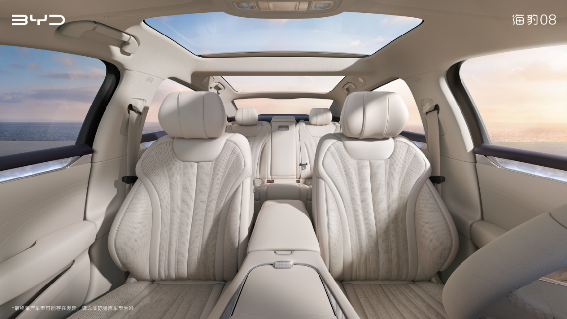 作为比亚迪海洋网首款大型旗舰轿车,海豹08的高端配置同样不负旗舰之名。结合图片座椅细节,新车预计将配备同级唯一前排双零重力座椅,一键躺姿,有效缓解疲劳;二排座椅配备电动腿托、靠背电动调节,并配备副驾靠背小桌板和中央扶手屏,满足办公、娱乐、休憩多种需求。全车有望实现座椅加热、通风、按摩功能,打造“前后皆舒享,座座VIP”的奢享体验。智能电吸门、全车双层隔音玻璃、车载香氛系统等高端配置预计将同步搭载,为用户营造静谧、舒适、有格调的私享空间。