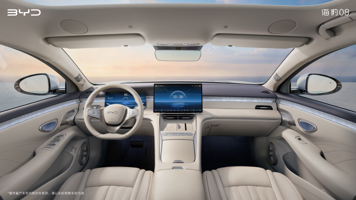 海豹08车身尺寸为5150mm*1999mm*1505mm,轴距3030mm,营造旗舰气场的同时,兼顾内部越级大空间,创新C柱无遮挡设计搭配分段式全景天幕,座舱视野与采光同达到同级顶尖水平,尽显大型旗舰的空间格局。内饰配色提供多种颜色可选,本次曝光的曦光米配色,干净高级、细腻明亮,并选用百万豪车同源光韵贝母饰板以及触感更舒适更高级的真皮材质,赋予座舱艺术品级轻奢质感,精准契合高端用户品质与审美需求,更多内饰颜色值得期待。