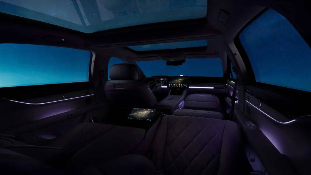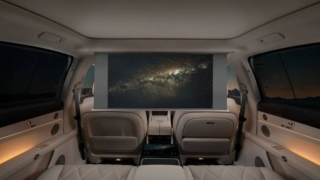 新款车型将标配后排零重力座椅套装,其中有12向电动调节的后排零重力座椅、电子式随身安全带和右后排小桌板。同时,这个版本也会标配智能激光投影系统,包括了投影光机、电动投影幕布、流媒体车内后视镜等,当幕布放下来之后也可以当做一个隐私隔挡,提供更加私密的后排空间。