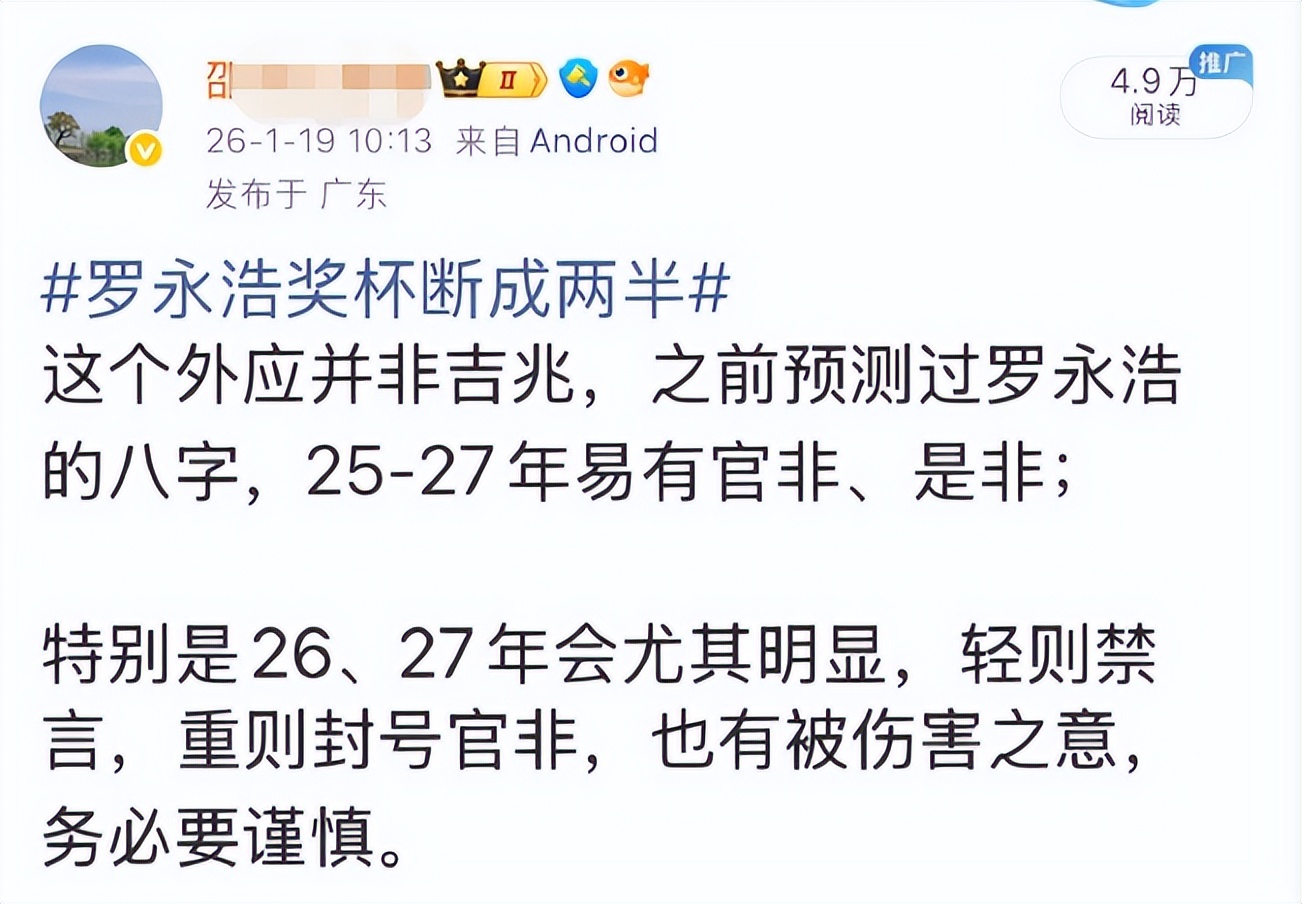 他说,奖杯断裂是不祥之兆,正好印证了他之前的预测,罗永浩未来两年容易有官非、是非,2026、2027年尤其明显,轻则禁言,重则封号,甚至还有“被伤害”之意,让罗永浩务必谨慎。