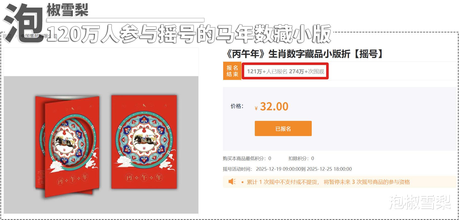 这次马年数藏小版中签名额只有3万个,预约量却达到了121万,能够吸引这么多人预约,无非是极高的收益率,反正预约没有门槛,中签则至少有200元的收益,不中签也没有什么损失,所以集邮不集邮的不重要,有利可图才是数藏小版折爆火的根本原因。