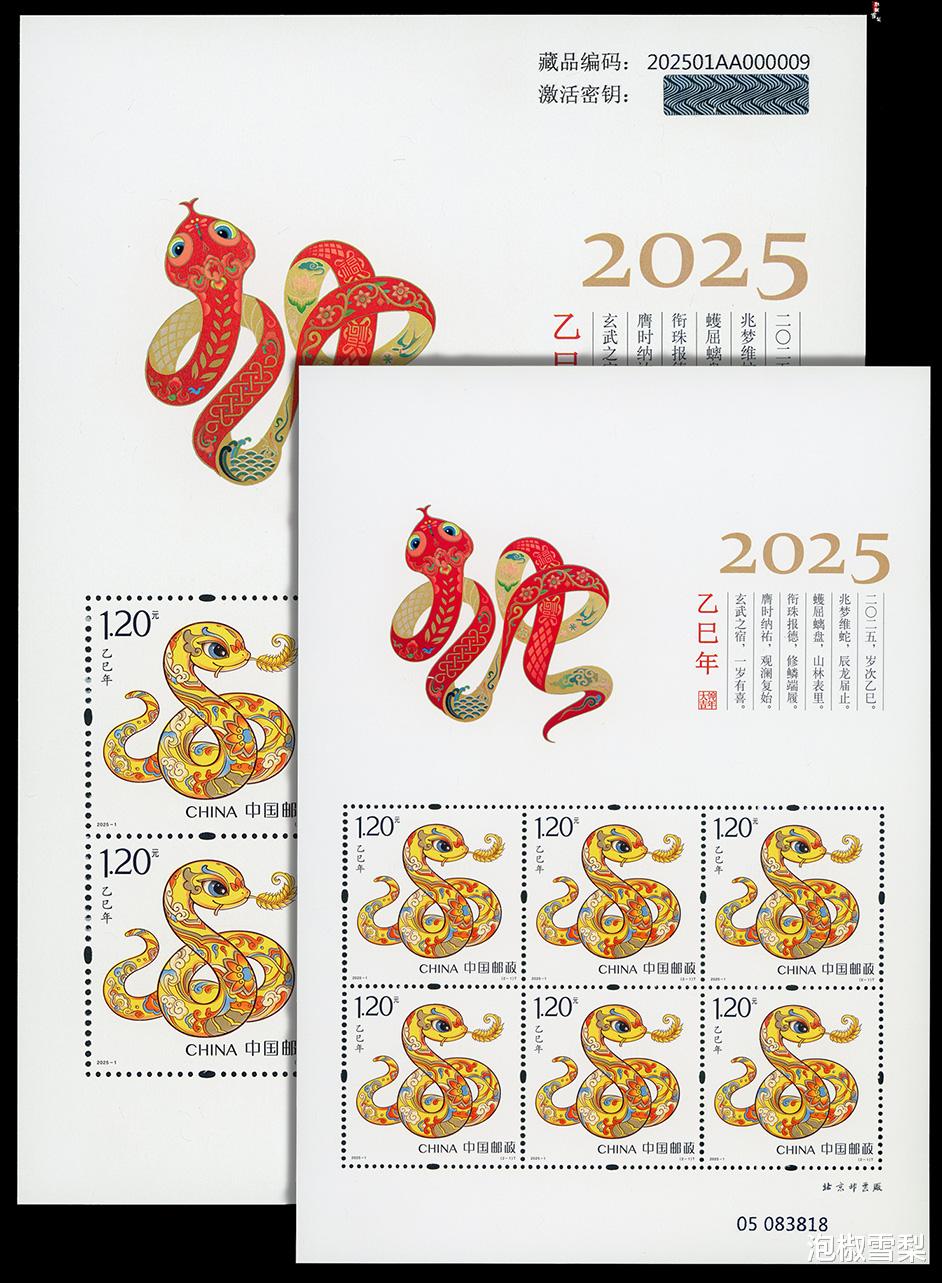 这两年生肖邮票类别中,热度最高的要属生肖数字藏品小版了,最早诞生于2024龙年的数藏小版,从发售价32元一路炒作到了1500元的天价,溢价率达到了30多倍。即使是过气的2025蛇数藏小版,市场价也有280多元,绝对算得上“编年号”邮票中的顶流了。