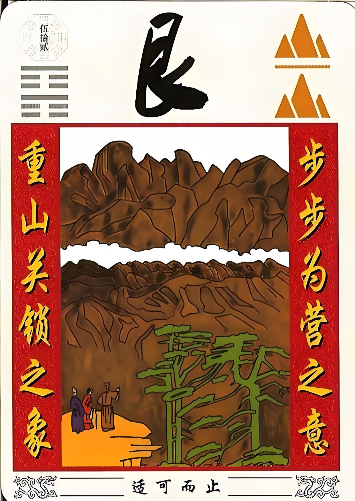 艮卦是《易经》六十四卦中的第五十二卦,象征山,代表静止、克制和止步。其卦辞“艮其背,不获其身”告诉我们,在行动中要学会适可而止,避免过度消耗自身资源。