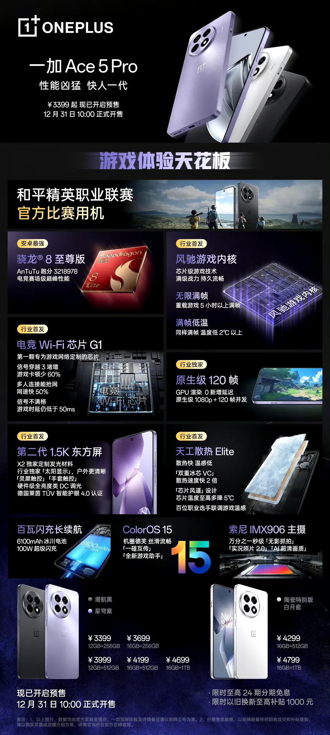 一加Ace 5 Pro搭载目前最强旗舰芯片骁龙8至尊版,拥有「开了挂」的芯片级风驰游戏内核,配备“穿墙王”行业首块「电竞Wi-Fi芯片G1」,全新升级天工散热Elite,新一代高性能冰川电池,赛场级触控体验等配置,打造出行业最顶级的游戏体验天花板,成为和平精英职业联赛官方用机。