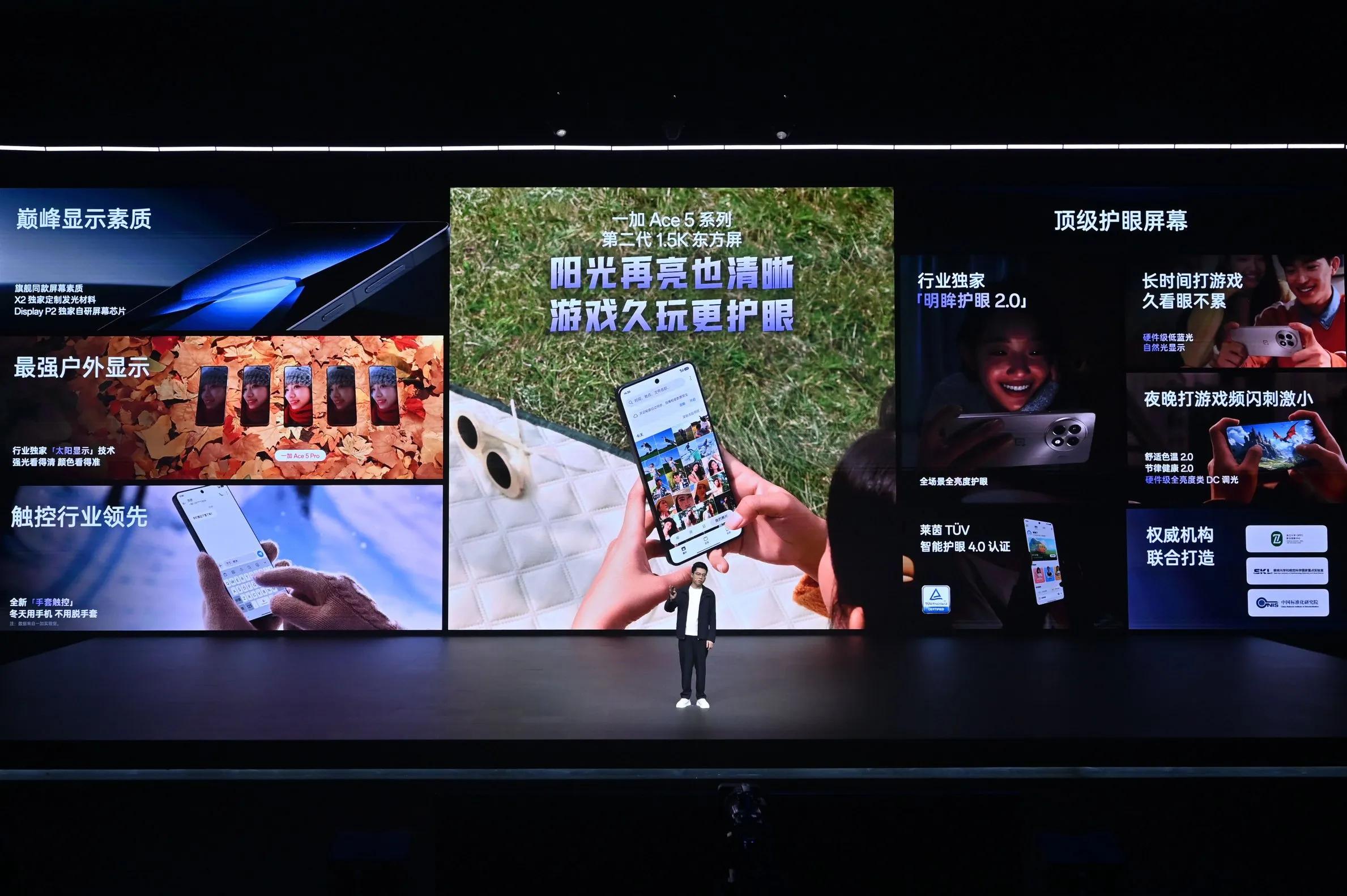发布会现场除了一加 Ace5Pro外,还有一加Ace5!本次一加Ace5系列首发第二代1.5K东方屏,采用BOE定制X2发光材料、自研显示芯片P2等旗舰同款配置,拥有行业最顶级的显示效果。一加Ace 5系列同样拥有「太阳显示」技术,以及「明眸护眼2.0」,既做到在户外强光环境下屏幕内容清晰可见、色彩精准,也能做到全场景护眼,在夜晚打游戏的场景下也能有效减少对眼部的刺激。冬日用机,一加Ace5系列也带来了「手套触控」,不用取手套也能灵敏操控手机,实用性极高。