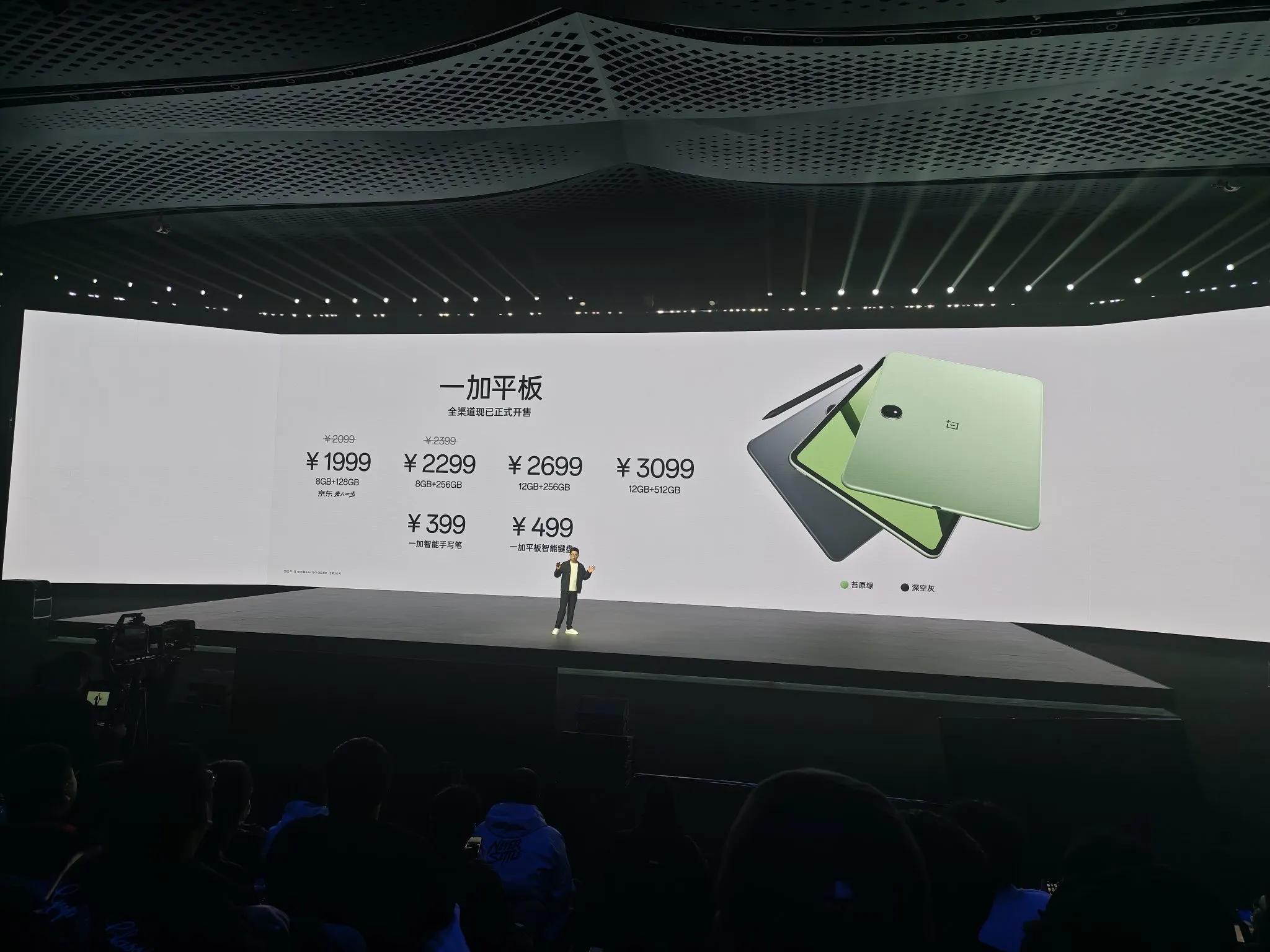 发布会上,一加还正式发布了一加平板,起售价1999元,首销还赠送一根手写笔。拥有苔原绿、深空灰两种配色,6.29mm厚,533g重,搭载了11.6英寸LCD全面屏,刷新率是144Hz,分辨率是2800×2000,采用7:5的屏幕比例,可以提供更舒适的观看和书写体验。核心搭载联发科天玑8350芯片,配备了超大34615mm²石墨烯散热面积,内置9520mAh电池,支持67W有线闪充。系统方面预装ColorOS 15系统,还支持NFC一碰互联、生态破壁互传,内置多种AI学习工具。价格方面,一加平板8GB+128GB首发1999元、8GB+256GB 首销2299元、12GB+256GB 2699元、12GB+512GB 3099元。一加智能手写笔定价399元、一加平板智能键盘499元。
