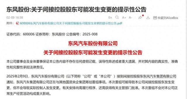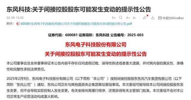 东风系公司密集公告东风股份(600006)、东风科技(600081)2月9日晚发布公告称,东风公司正在与其他国资央企集团筹划重组事项。本次重组可能导致本公司间接控股股东发生变更,但不会导致实际控制人发生变更。