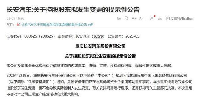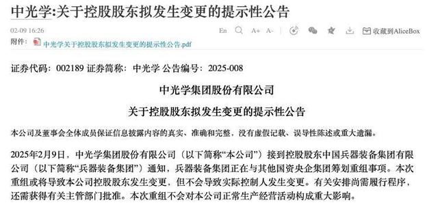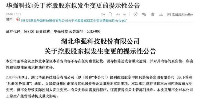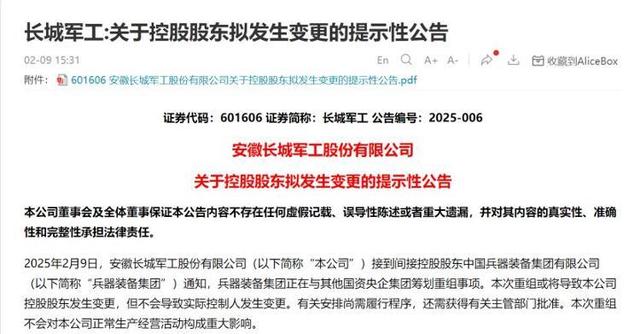 兵装系上市公司密集公告同一天,长安汽车(000625)、长城军工(601606)、哈飞动力(600178)、建设工业(002265)、华强科技(688151)、中光学(002189)等多家兵器装备集团旗下公司发布公告,兵器装备集团正在与其他国资央企集团筹划重组事项。本次重组或将导致公司控股股东发生变更,但不会导致实际控制人发生变更。