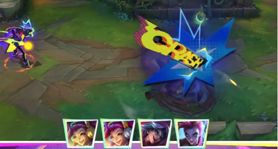 全技能的电磁科技风特效非常醒目,大招命中敌人后同样是展现金克丝的玩具小熊画像,色彩上与狂潮·裂变的差别很大。