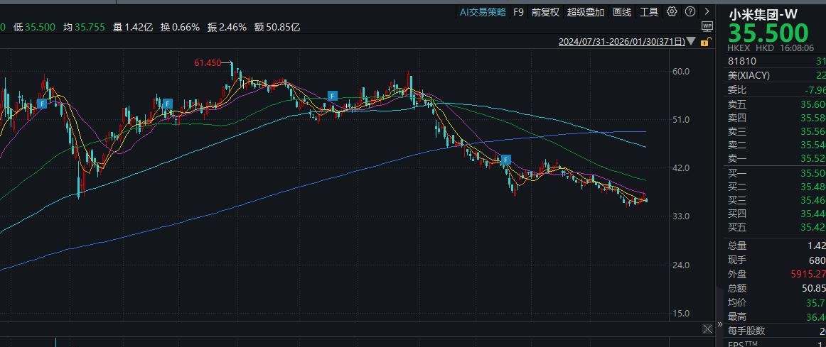 自2025年6月27日触及61.45港元的历史高点后,小米集团股价开启下行通道,9月起进入“阴跌模式”,连续7个月收跌,截至2026年1月31日,累计跌幅超40%,跌回到2025年初的股价。
