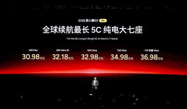 与此同时,2026款小鹏X9纯电版重磅上市,产品力全面对齐超级增程版,以“两种动力,同一个旗舰标准”的硬核实力重新定义高端家用大七座新标杆。纯电版新车共推出5款版型,包括665 Max、650 Ultra SE、650 Ultra、750 Ultra以及710 四驱 Ultra,官方指导售价分别为30.98万元、32.18万元、32.98万元、34.98万元及36.98万元。此次焕新,还带来了2026款小鹏X9增程版1602 Ultra SE,官方指导售价为32.18万元。