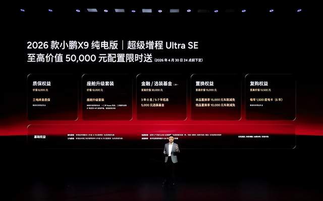 即日起至2026年4月30日24点(含)前下定2026款小鹏X9纯电版,可享最高价值50,000元 权益限时送,包含三电终身质保、价值12,000元的座舱升级套装、至高价值30,000元金融/选装基金、至高价值15,000元置换权益以及每年1500度电卡(6年)的复购权益。2026款小鹏X9超级增程权益与2026款纯电版权益一致(2026年3月31日24:00前下定),此外24和25款的小鹏X9车主置换26款小鹏X9可以获得额外1万元的代金券补贴。(2025年11月20日已发放)