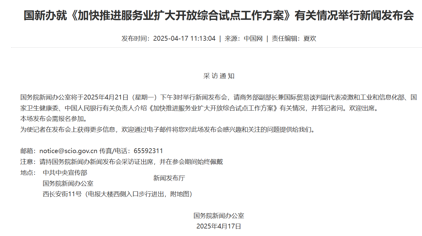 近日,政策消息频出,提振市场信心。4月17日,据国新办网站消息,国务院新闻办公室将于2025年4月21日(星期一)下午3时举行新闻发布会,请商务部副部长兼国际贸易谈判副代表凌激和工业和信息化部、国家卫生健康委、中国人民银行有关负责人介绍《加快推进服务业扩大开放综合试点工作方案》有关情况,并答记者问。