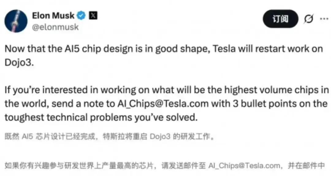 当时马斯克给出的公开解释是:同时开发两种完全不同的AI芯片,资源太分散了,不合理。所以决定壮士断腕,把所有火力都集中在AI5、AI6这些后续芯片上。