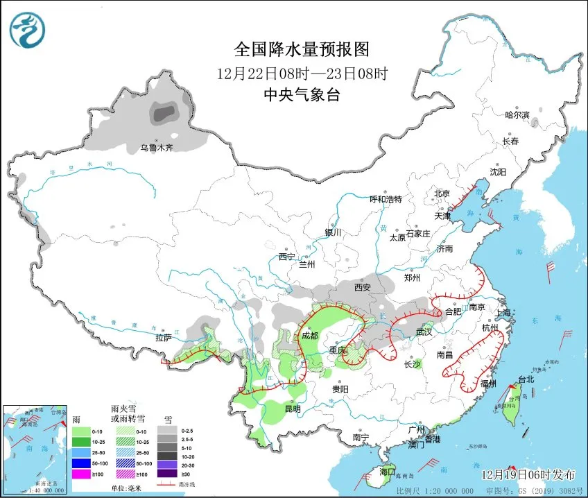 在12.21之后,我国西南等方向有雨雪过程, 川西高原东部、西藏东部、云南西北部等区域明显,然后往我国东部方向进行扩散,其长江流域的降雪较为突出。
