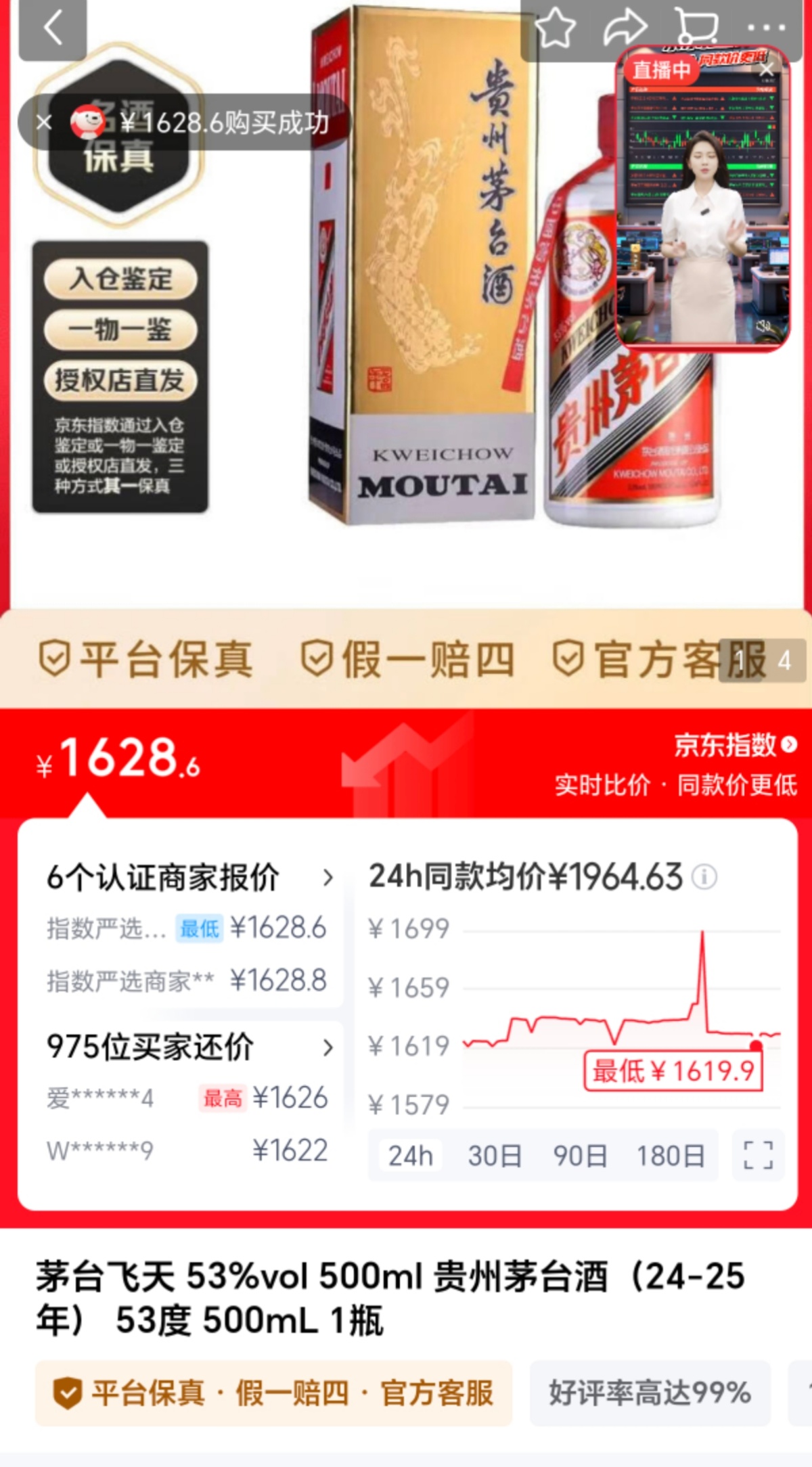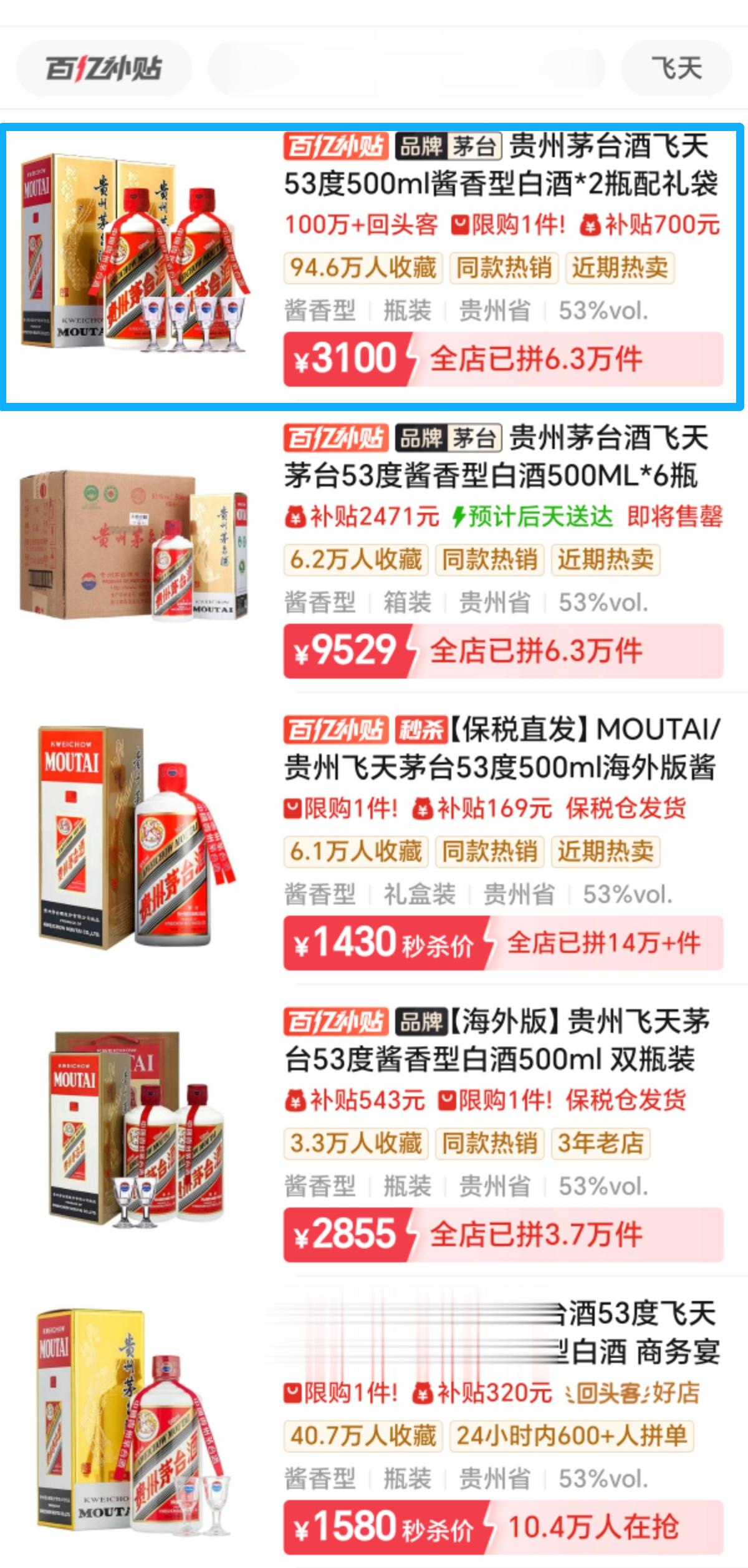 像老张这样面临出货压力的商户不在少数。与线下渠道的价格波动相比,网络平台的价格相对稳定。月初,拼多多曾以“1399元/瓶”的补贴价引发关注,但12月16日记者在该平台已搜不到此链接,其“百亿补贴”价为3100元/2瓶(折合1550元/瓶)。