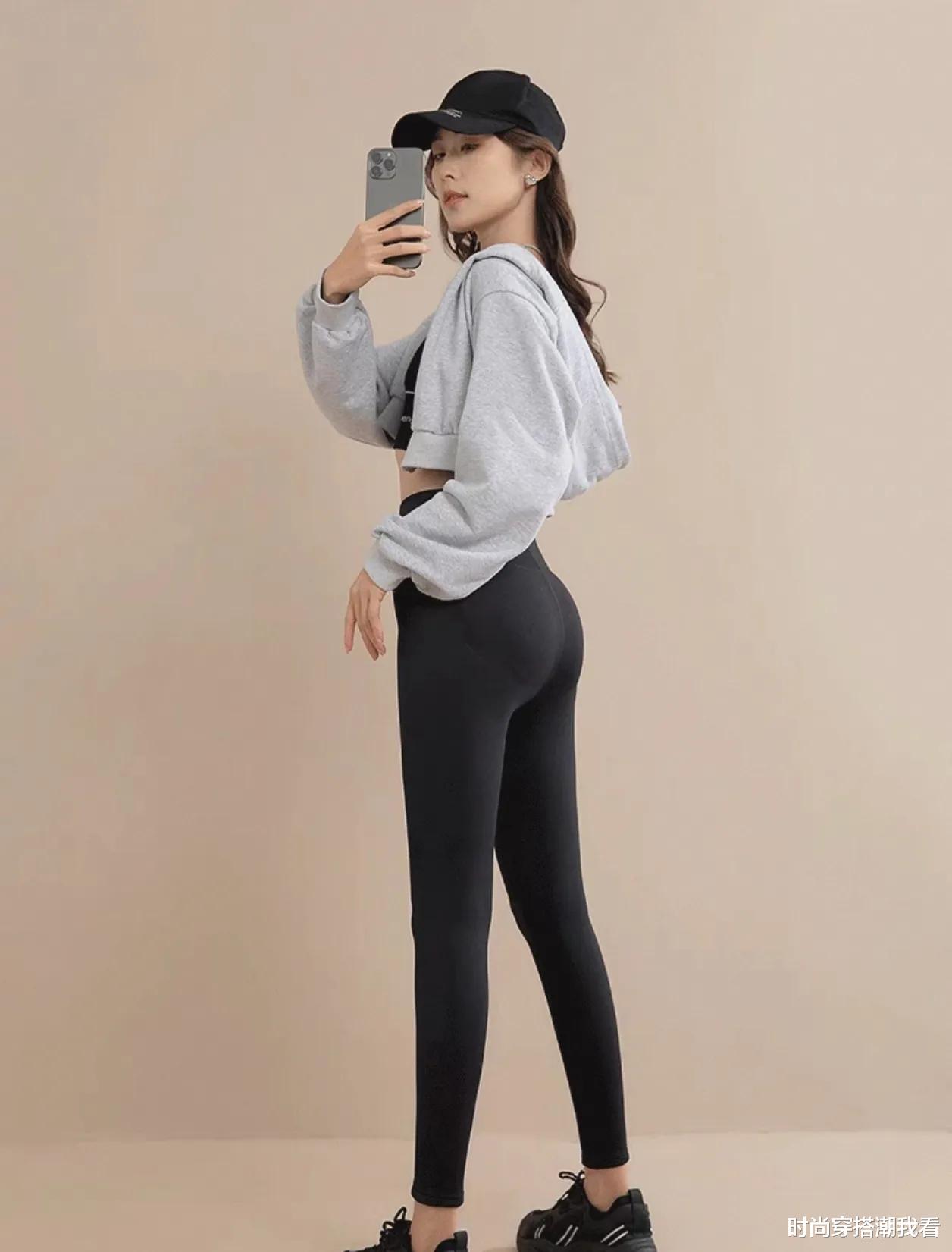 宽松卫衣+瑜伽裤:选择一件宽松版型的卫衣,搭配紧身瑜伽裤,形成“上松下紧”的穿搭效果。卫衣的长度可以遮住臀部,修饰身材线条,同时增加穿搭的层次感。
