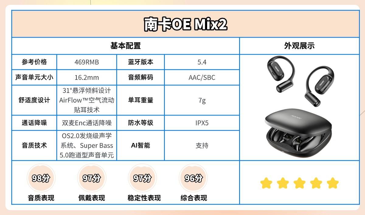 在音质方面,南卡联合100多名声学工程师与20多位发烧友,共同打造出Super Sound OS2.0声学系统,可智能调节声谱频率并自动补偿音质曲线。配合全新Super Bass5.0跑道型高性能单元与6+3维空间音频技术,实现高达99.9%的音质还原率,让声音层次更清晰、细节更丰富,高频明亮、中频自然、低频饱满,呈现沉浸式立体听觉体验。凭借出色表现,OE Mix2获得多家国际专业机构认证,并被500位数码博主推荐,在行业中几乎无可替代。