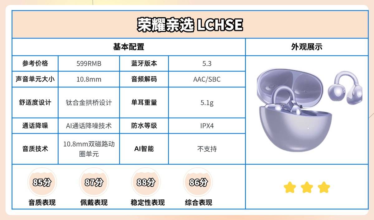 荣耀LCHSE耳机引入了中式拱桥的造型理念,并运用钛合金等多重材质,在科技设计中透出传统美学韵味。外壳采用钛合金与耐磨PC复合材质,既实现轻量化又确保耐用性,单耳重量控制在约5.1克。