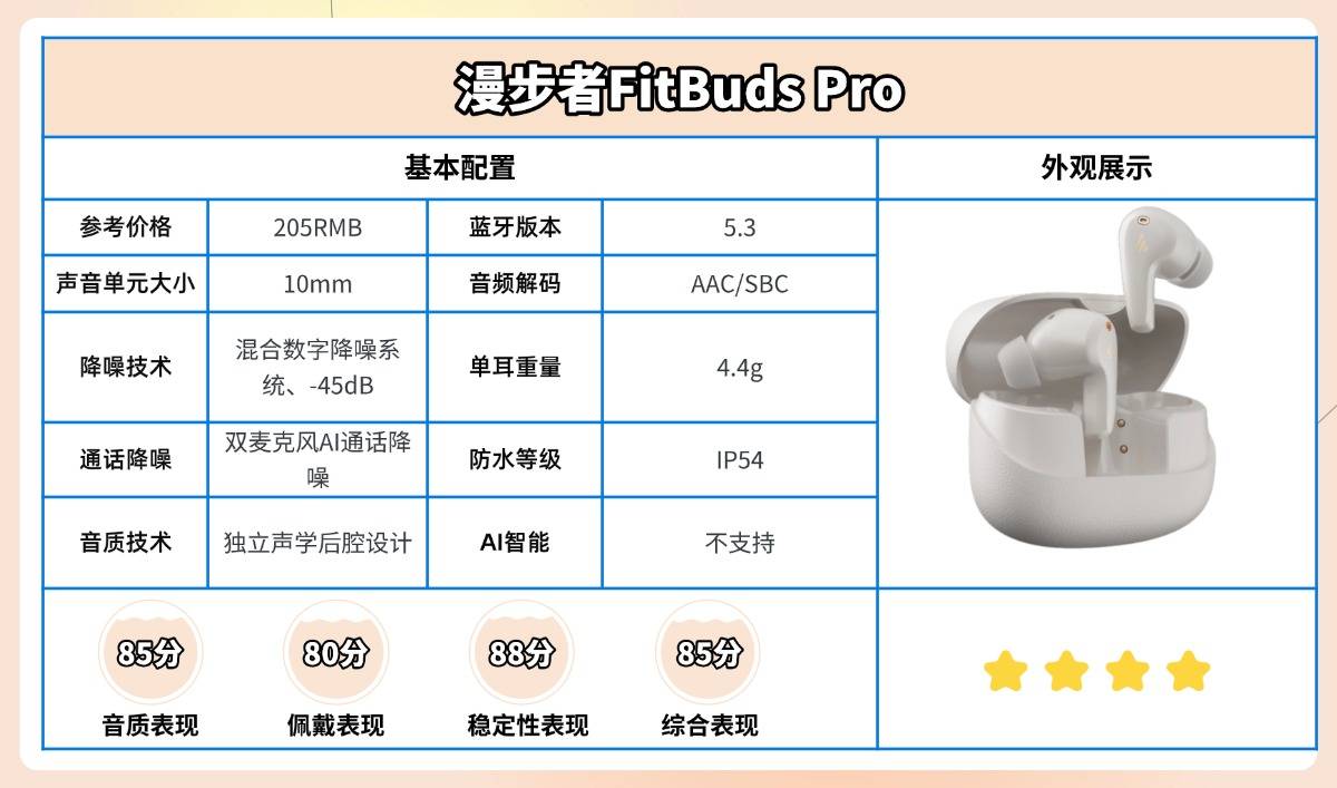 此外,随机附赠的耳套抗菌率达到99.9%,全面注重耳部卫生,体现出对用户健康的细致考虑。总体来看,漫步者FitBuds Pro在功能配置与性价比之间取得了不错平衡,是一款适合学生及上班族日常使用的实用型耳机。