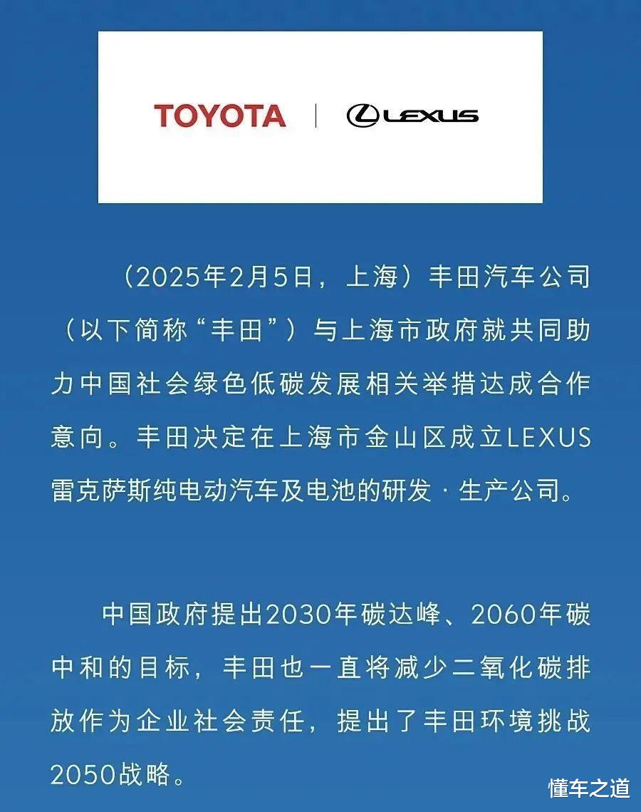 丰田汽车公司与上海市政府就共同助力中国社会绿色低碳发展相关举措达成合作意向。丰田决定在上海市金山区成立LEXUS雷克萨斯纯电动汽车及电池的研发·生产公司。