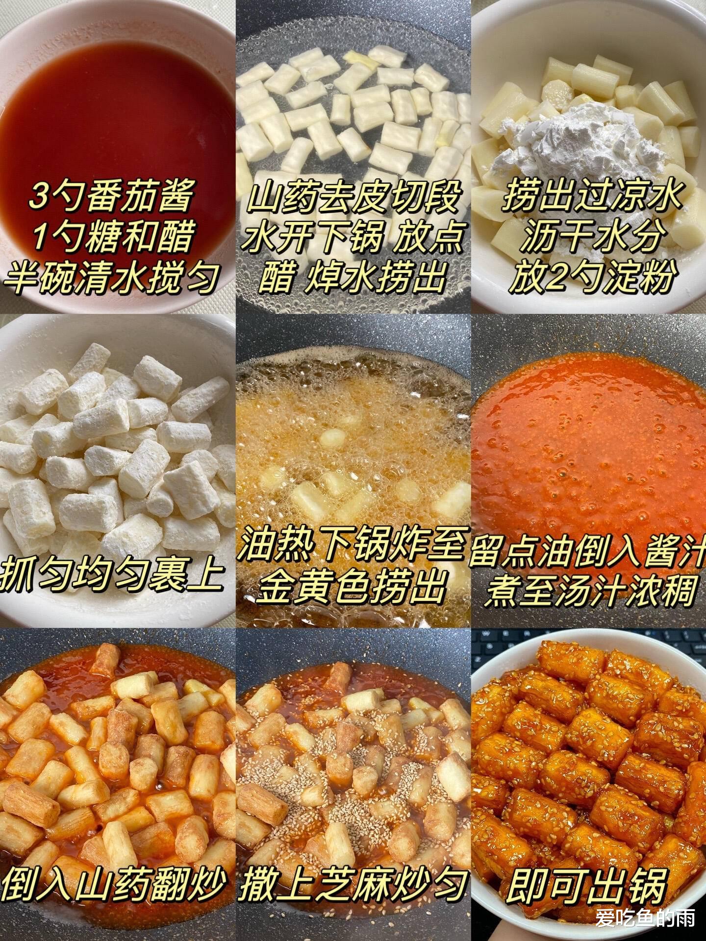 重头戏就是那碗黄金糖醋汁。记住口诀:1酒、2酱、3糖、4醋、5水。也就是一勺料酒、两勺生抽、三勺白糖、四勺陈醋、五勺清水,再挤一大勺番茄酱进去,那颜色瞬间红亮诱人,酸甜度也刚刚好,不需要你拿着筷子尝半天,按比例调基本零失误!锅里留底油,把酱汁倒进去熬到冒大泡,迅速倒入炸好的山药,这时候要展现你的麒麟臂了,大火快速翻炒,让每一块山药都裹上晶莹剔透的琥珀色外衣,动作要快,姿势要帅,十几秒就能出锅!