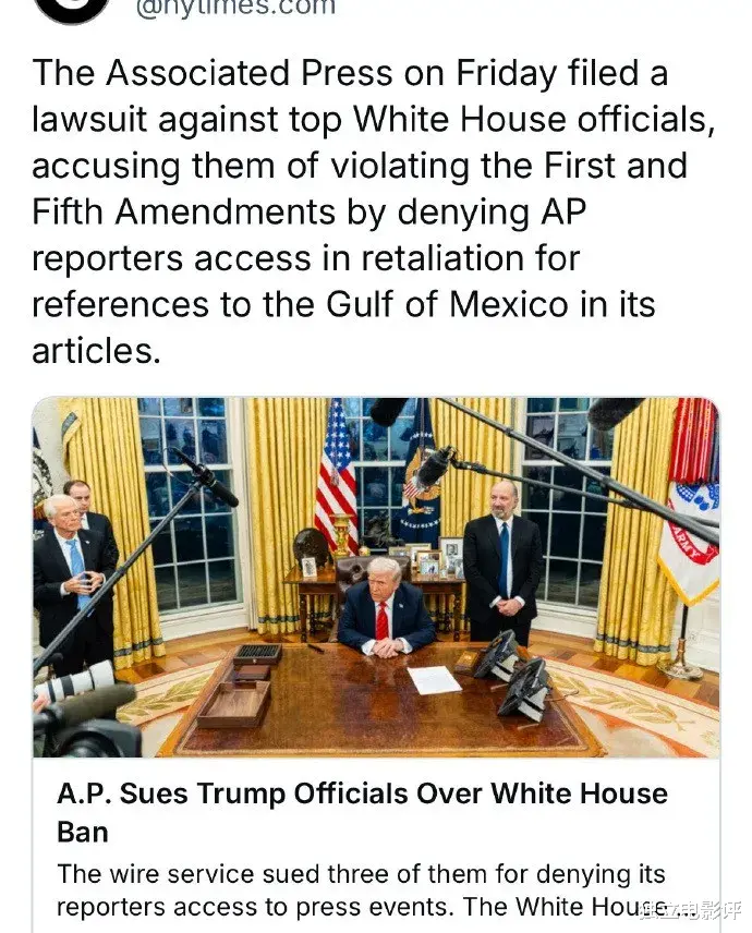 美联社起诉白宫违反第一和第五修正案。因为美联社不改称墨西哥湾为美利坚湾,他们的记者被禁入白宫。