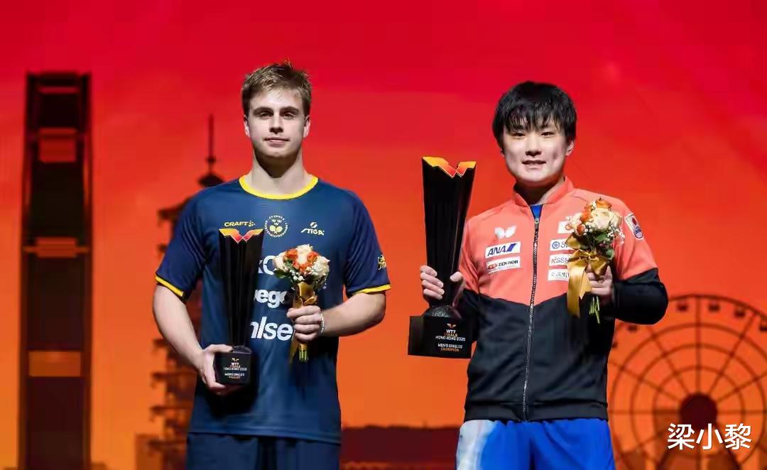 张本智和首次拿到总决赛的冠军,一副把自己忙坏了的样子。