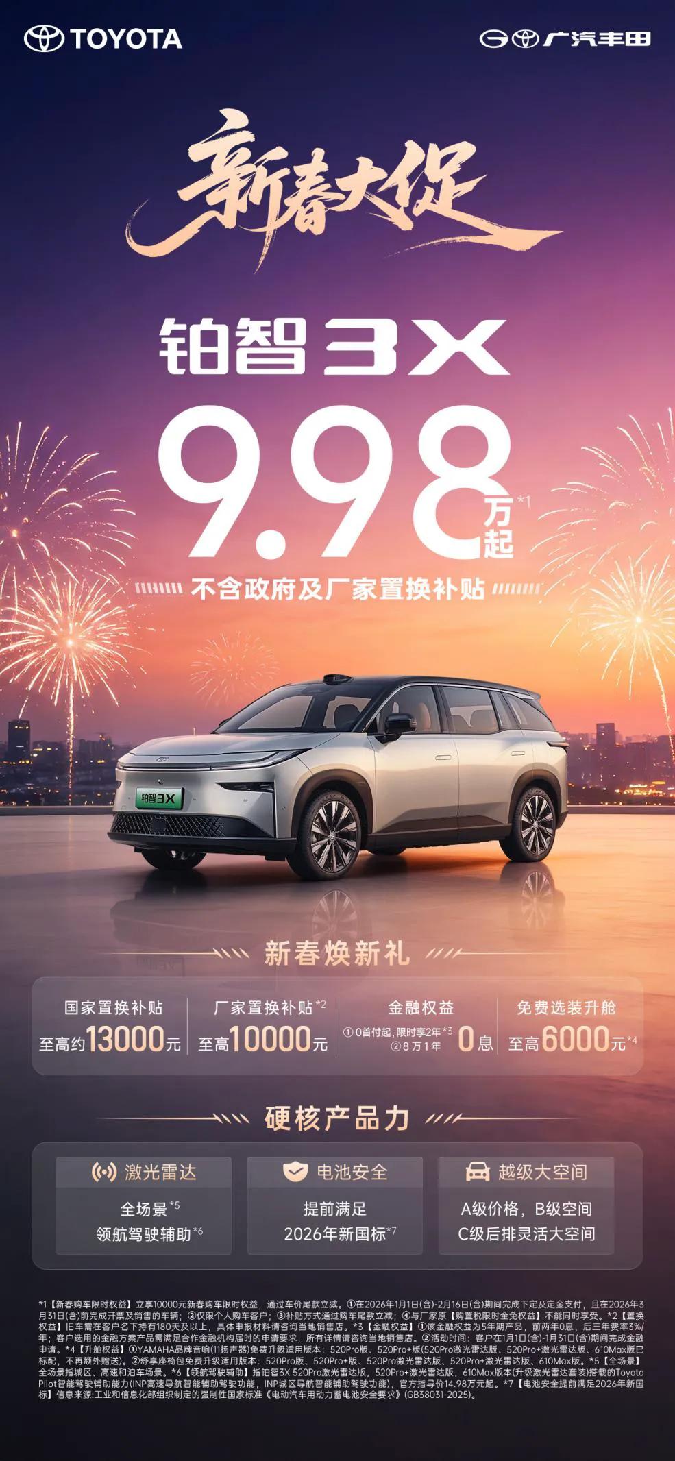 这波限时大促主打“诚意满满、不玩套路”,就是为了让大家赶在新春前能提车。作为广汽丰田销量占比9%的主力车型,铂智3X不仅是广汽丰田转型的排头兵,更是你过年回家的最佳拍档。抓紧现在的政策窗口,把实惠握在手里才是硬道理。