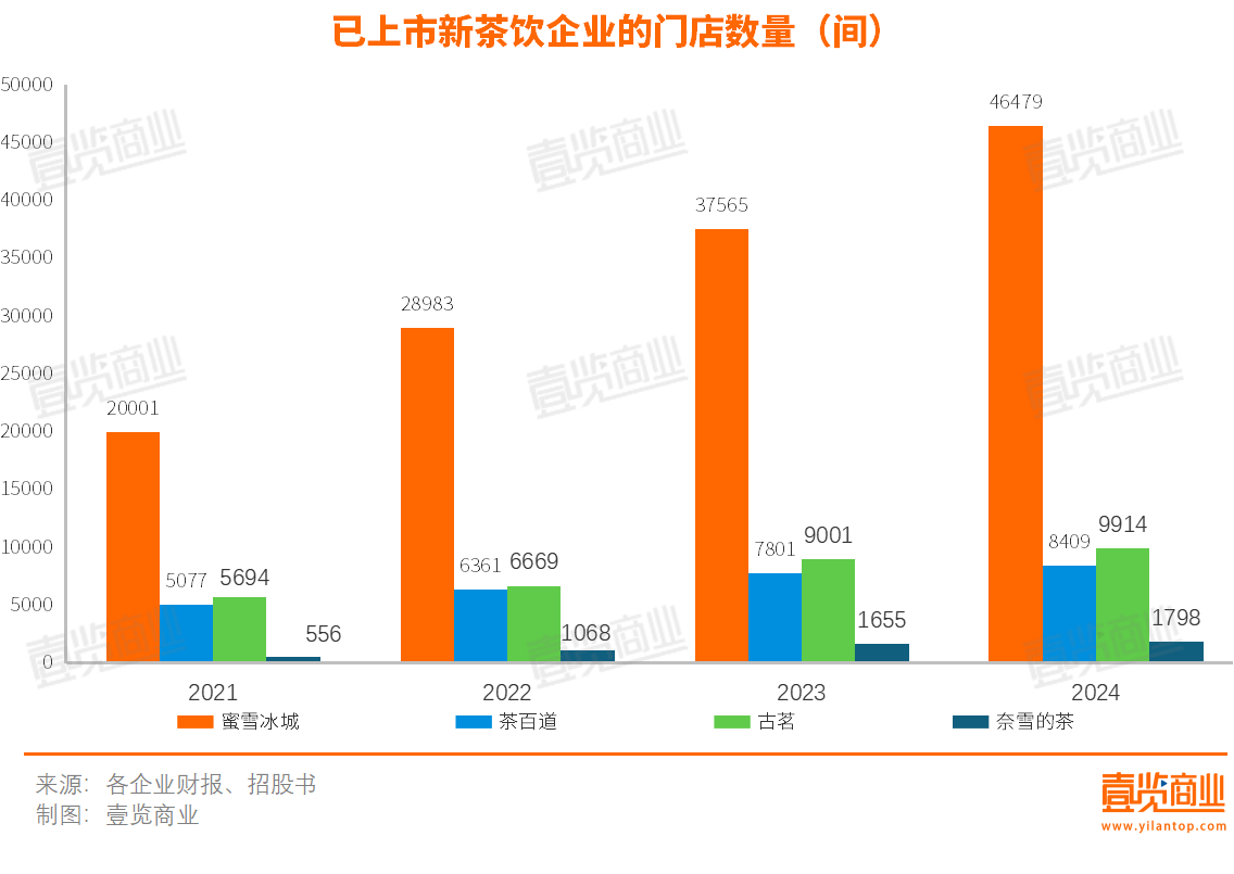 从门店规模看,4家上市新茶饮企业中,除了奈雪的茶门店数较少外,另外3家的门店数量均位于行业前列。截止2024年12月31日,蜜雪冰城门店数突破4.6万,古茗门店数量达9914,距离万店仅一步之遥,茶百道门店数量达8409家。