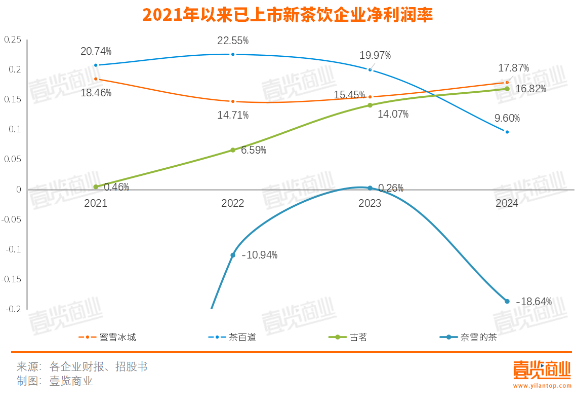 其中,蜜雪冰城和古茗以净利润率17.94%和16.82%对茶百道(9.6%)形成梯度优势,而奈雪的茶则以-18.64%的净利率垫底。