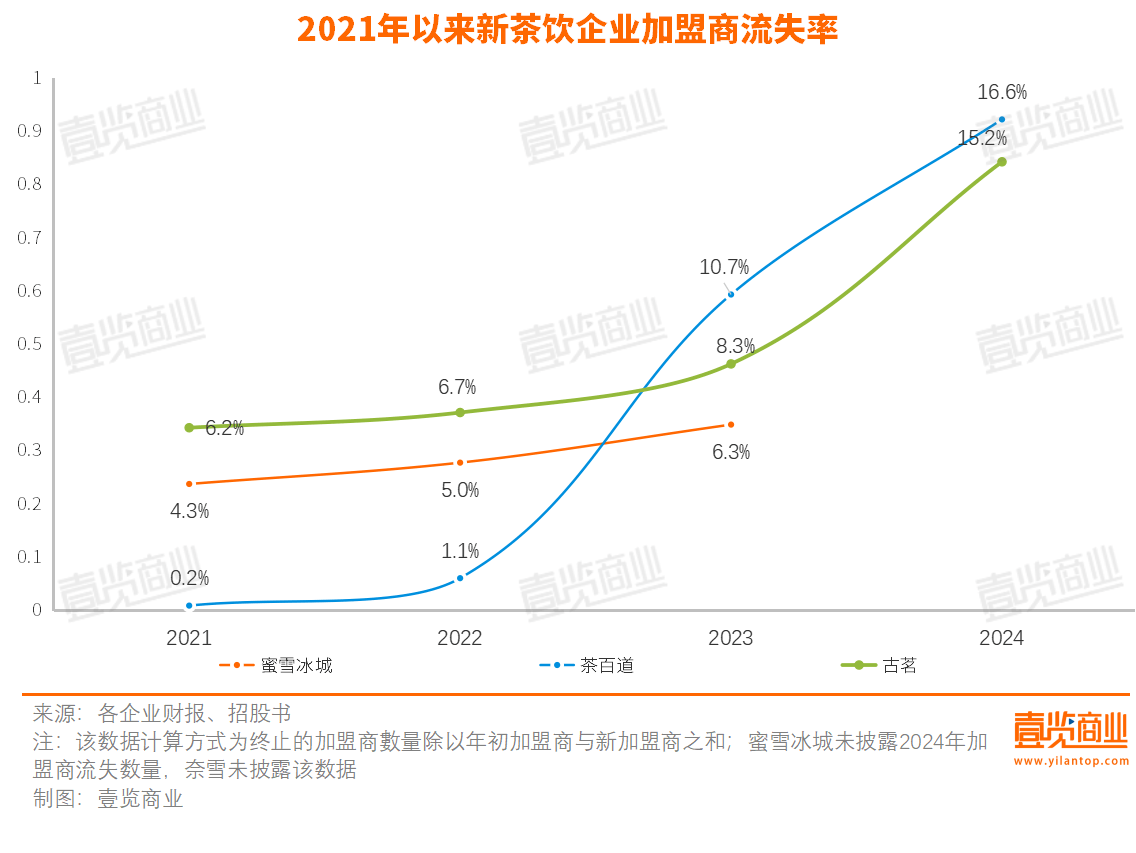 具体看,2024年茶百道的加盟商流失率最高,达16.6%,共有1144位加盟商终止合作;古茗的流失率在扩大,由2021年的6.2%扩大至2024年的15.2%,2024年有871位加盟商退出;蜜雪冰城的加盟商流失率维持在5%左右,基本控制住了。